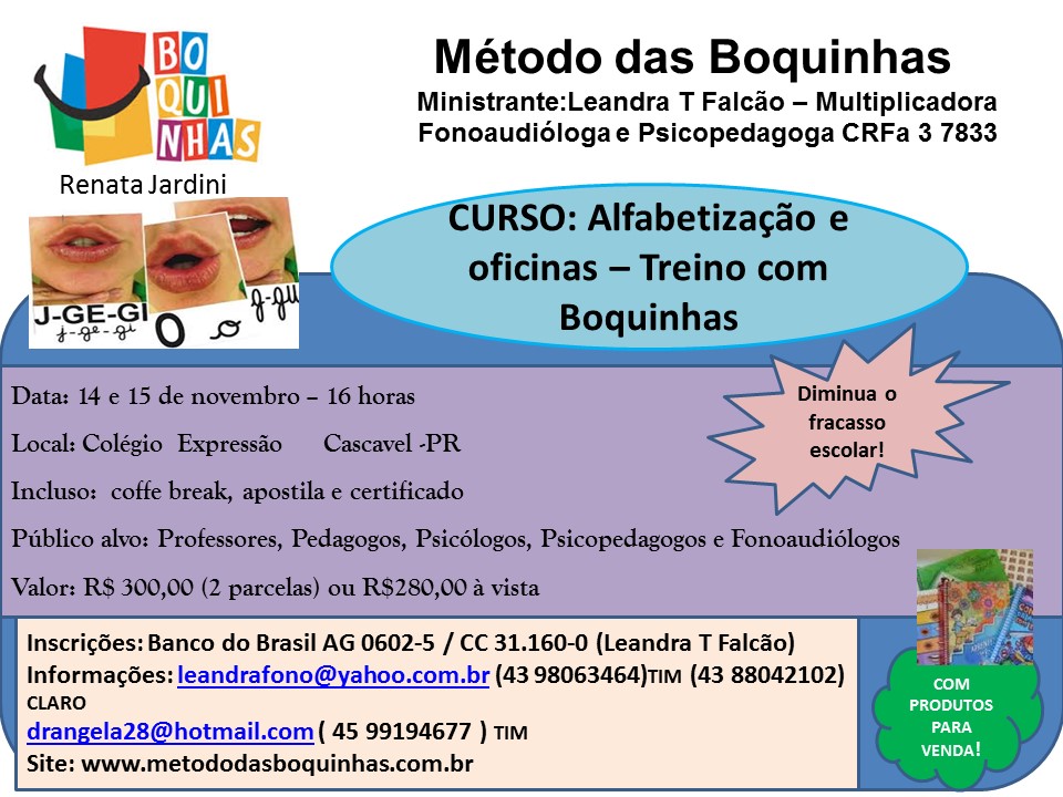 Você conhece o Método das Boquinhas? Metodologia de alfabetização aprovada pelo MEC para tanto alfabetizar e intervir nos Distúrbios e Dificuldades de Leitura e Escrita, além claro, das Dislexias. O Método visa o trabalho de forma concreta, utilizando de forma multissensoriais as entradas de conexões cerebrais para aprendizagem.