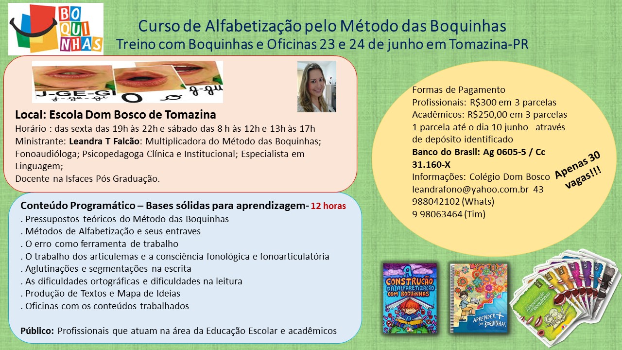 Os educadores de TOMAZINA e região, localizada no Norte Pioneiro do Paraná serão capacitados com o Curso do Método das Boquinhas, Alfabetização e Oficinas com Treino de Boquinhas! O curso será no Colégio Dom Bosco aberto ao público. Vamos aproveitar essa oportunidade e fazer a diferença na educação brasileira. Venha conhecer a metodologia mais sensorial e objetiva, que facilita o processo de alfabetização de seu aluno ou paciente. O Método das Boquinhas é utilizado em sala de aula e muitos municípios já adotaram como metodologia principal. Ajuda no processo de alfabetização por ser concreto e também nas intervenções das dificuldades da linguagem escrita e leitura. Faça sua inscrição e ajude a combater com o fracasso escolar!!!