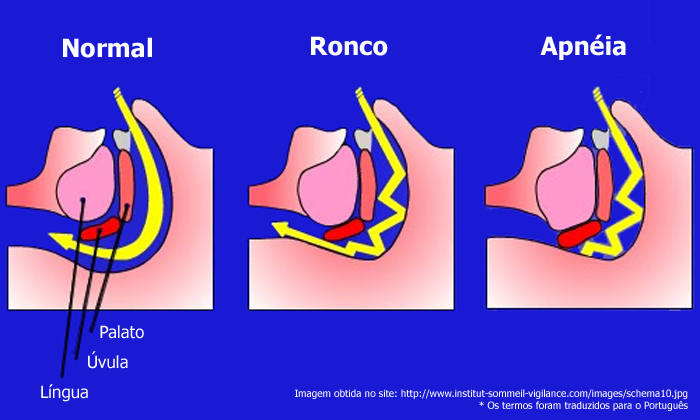O ronco e simplesmente a tradução sonora que indica diminuição ou estreitamento da via aérea durante a passagem do ar. Se o referido estreitamento torna-se severo, objetiva-se o fechamento ou colapso da via aérea, resultado da apnéia. A apnéia é arbitrariamente definida como parada da respiração ou interrupção do fluxo aéreo por no mínimo 10 segundos. A Hipopnéia é definida como significante diminuição de oxigenação (dessaturação da oxihemoglobina) e/ou despertares transitórios.