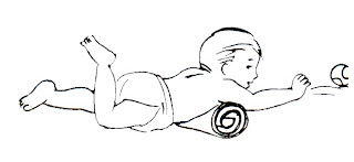 Com a criança de costas, faça-a rolar lentamente atingindo a posição de bruços. Procure chamar a atenção dela, colocando brinquedos coloridos do se lado.